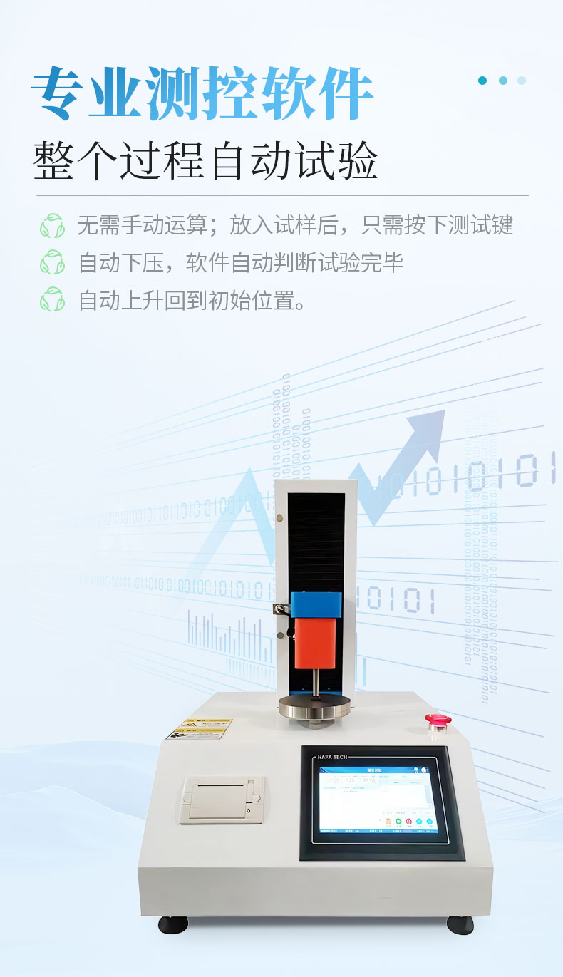 7、軟件:專(zhuān)業(yè)測(cè)控軟件,整個(gè)過(guò)程自動(dòng)試驗(yàn),無(wú)需手動(dòng)運(yùn)算;放入試樣后,只需按下測(cè)試鍵,自動(dòng)下壓,軟件自動(dòng)判斷試驗(yàn)完畢,自動(dòng)上升回到初始位置。