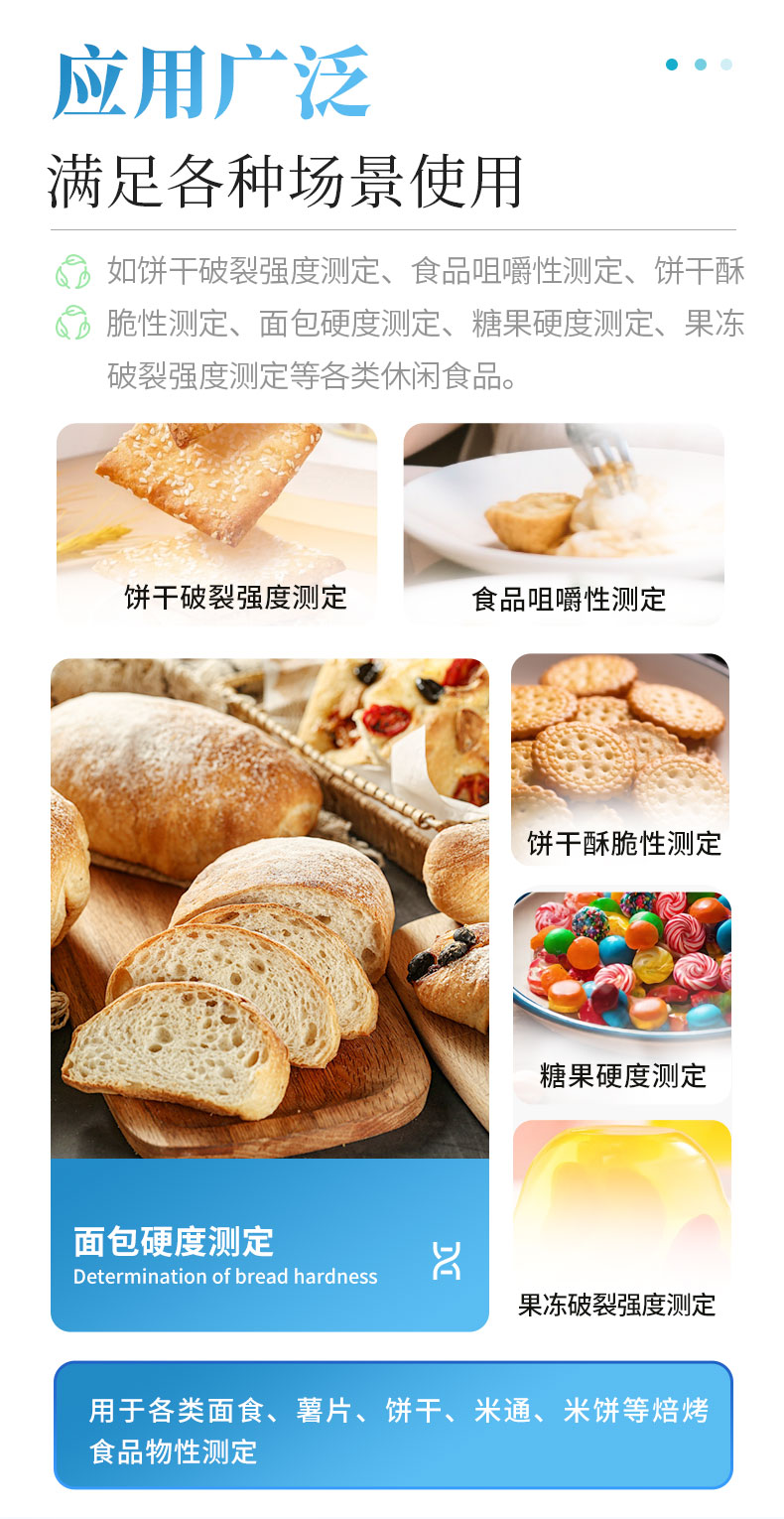 食品硬度儀適用于各類(lèi)面食、薯片、餅干、米通、米餅等焙烤食品物性測(cè)定,如餅干破裂強(qiáng)度測(cè)定、食品咀嚼性測(cè)定、餅干酥脆性測(cè)定、面包硬度測(cè)定、糖果硬度測(cè)定、果凍破裂強(qiáng)度測(cè)定等各類(lèi)休閑食品。