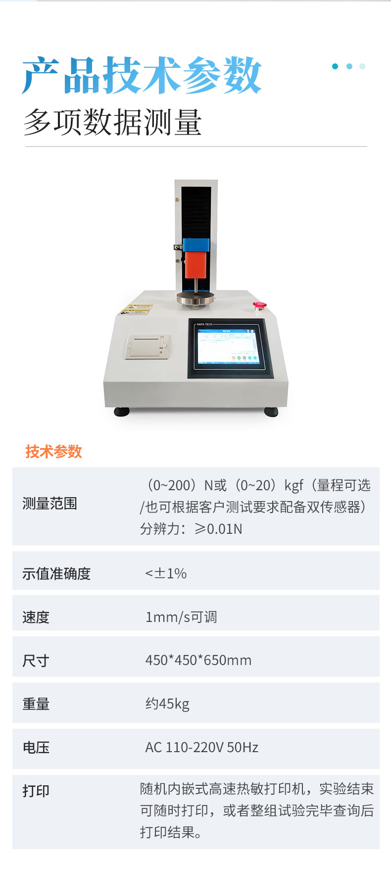 1、測(cè)量范圍:(0~200)N或(0~20)kgf(量程可選/也可根據(jù)客戶(hù)測(cè)試要求配備雙傳感器)分辨力:≥0.01N