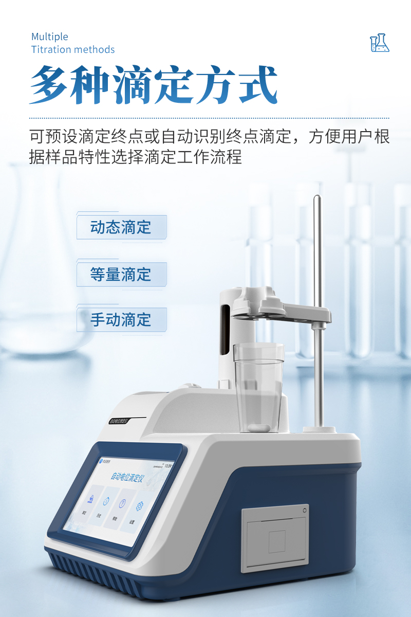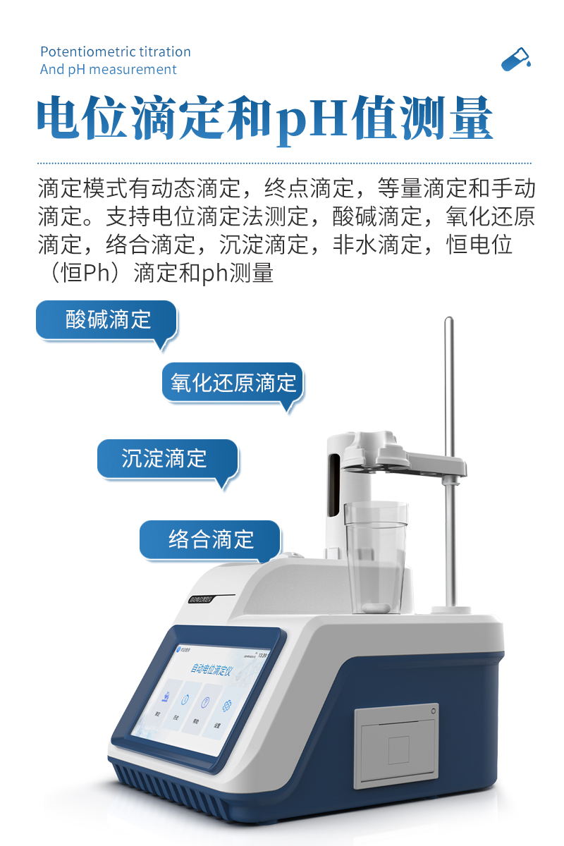 自動(dòng)電位滴定儀是一種用于化學(xué)分析的精密儀器,他通過(guò)自動(dòng)添加滴定劑來(lái)確定樣品中特定成分的濃度。該儀器基于電位滴定原理工作,即根據(jù)在滴定過(guò)程中電池電動(dòng)勢(shì)的變化來(lái)確定滴定終點(diǎn)的一款滴定設(shè)備。設(shè)備滿足國(guó)家檢定規(guī)程JJG 814-2015《自動(dòng)電位滴定儀》儀器級(jí)別中的0.05級(jí)別,即儀器**示值誤差為±1.5%,儀器示值重復(fù)性≤0.2%
