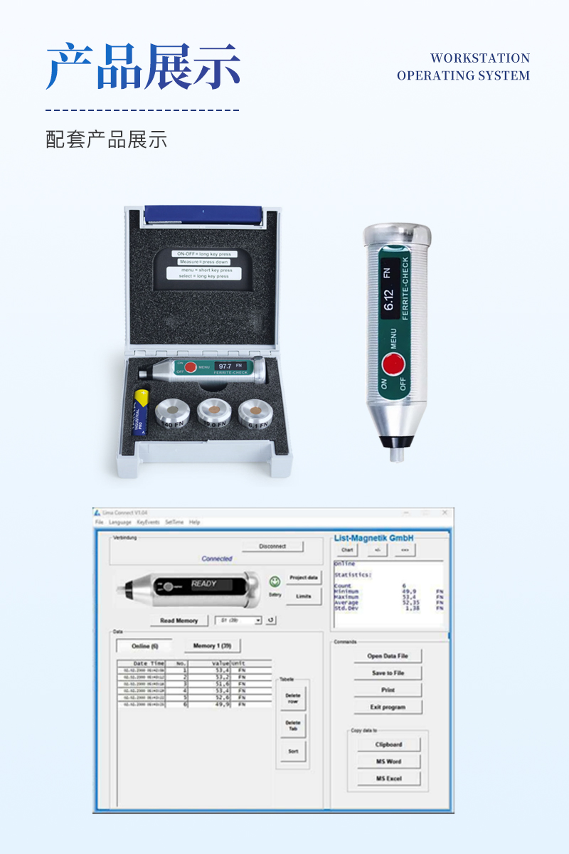 為了進(jìn)一步處理測量數(shù)據(jù),您可以將FERRITE-CHECK 140鐵素體含量檢測儀與移動Android和iOS設(shè)備配對?;蛘吲c一臺Windows電腦通信。這是由低功耗藍(lán)牙技術(shù)(BLE)實現(xiàn)的。使用Lima Connect應(yīng)用程序,您可以管理項目并在照片上分配測量點。測量結(jié)果可以統(tǒng)計評估和圖形顯示。這款應(yīng)用適用于安卓、iOS和Windows系統(tǒng),軟件免費(fèi)的。