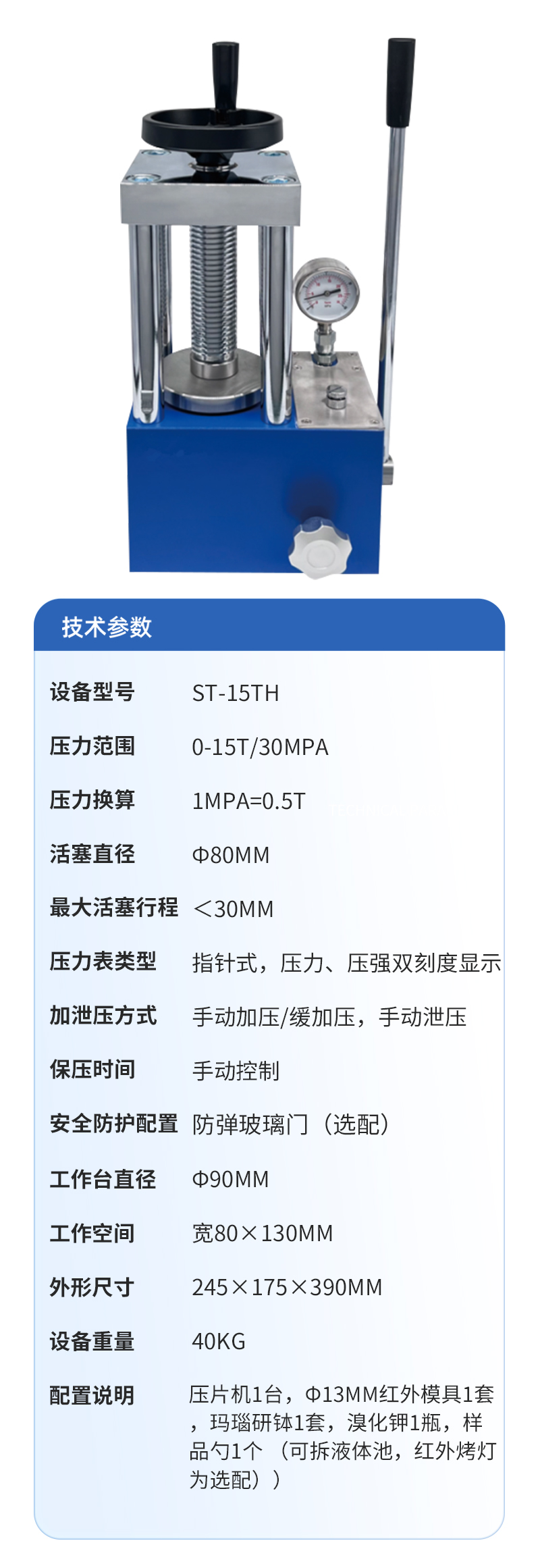 | 配置說明 | 壓片機1臺,Φ13mm紅外模具1套,瑪瑙研缽1套,溴化鉀1瓶,樣品勺1個 (可拆液體池,紅外烤燈為選配) |